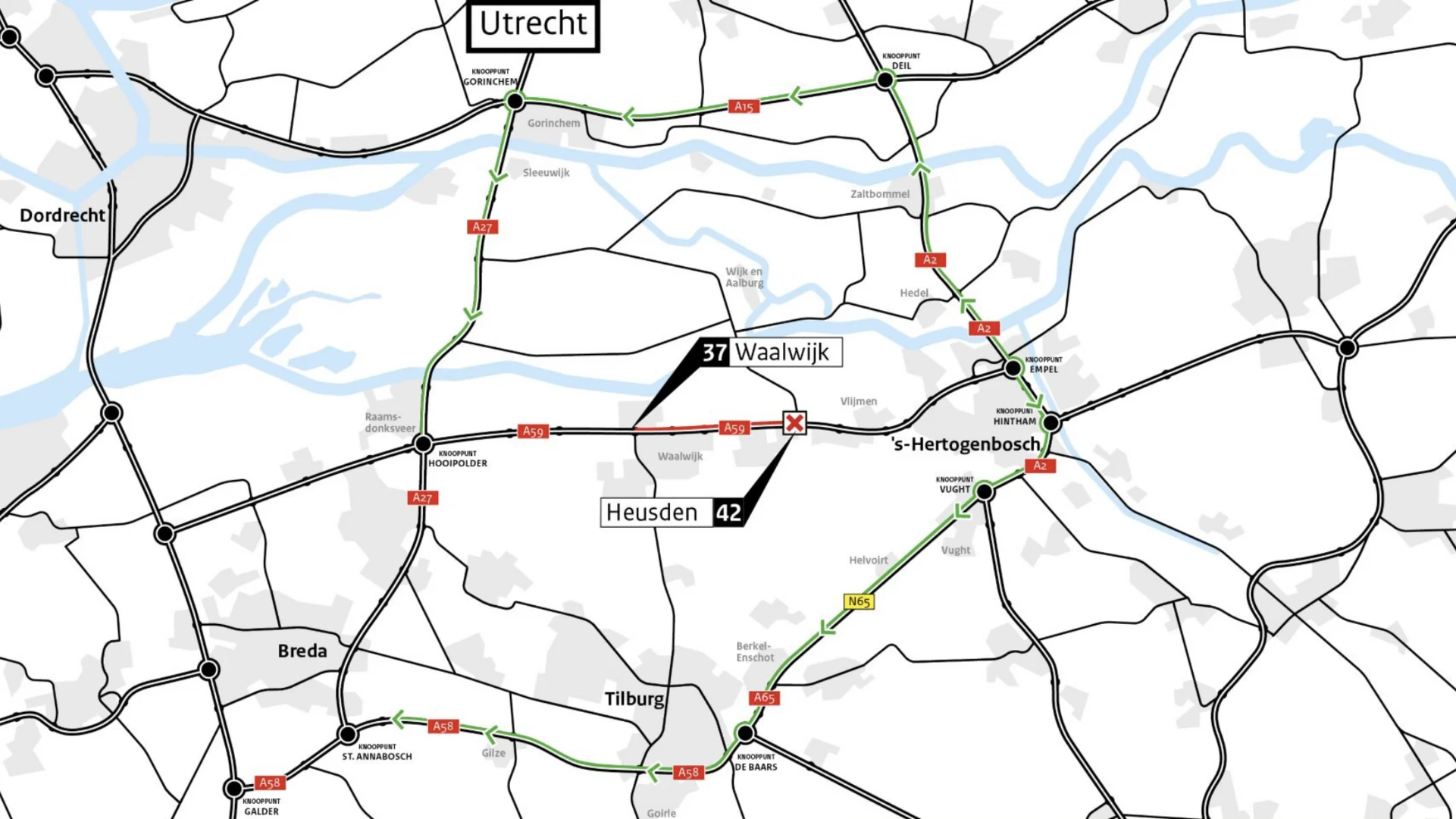 Rijkswaterstaat adviseert reizigers om rekening te houden met een extra reistijd van ongeveer 30 minuten. Er zijn verschillende omleidingen ingesteld die met gele borden worden aangegeven: richting Breda: omrijden via de A2, N65/A65 en de A58 en richting Oosterhout en Gorinchem: omrijden via de A2 en de A15.
